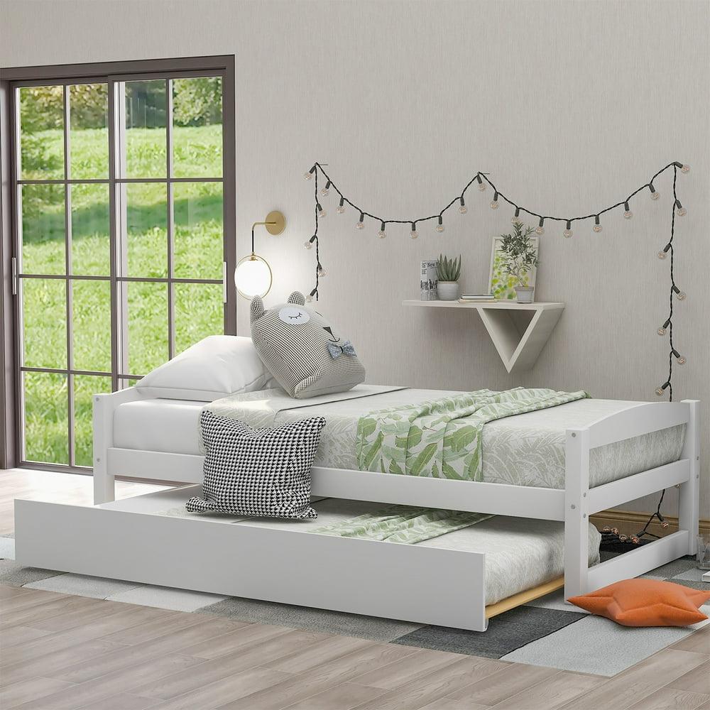 Create a monochrome layout by pairing black or white frames with furniture in lighter or darker shades. With a unique appearance and sturdy frame, the bed can make bedtime more joyful, providing unlimited fun for your kid. Twin over twin bunk bed with trundle,kids bunk bed frame with twin size trundle and guard rail ladder,kids bunk beds convertible to 2 twin size platform bed,trundle bed for bedroom girls boys,white. Built on a solid and engineered wood frame, it is upholstered in polyester with a light gray hue for a piece that works with your current color palette. A small space doesn't mean you can't host overnight guests.